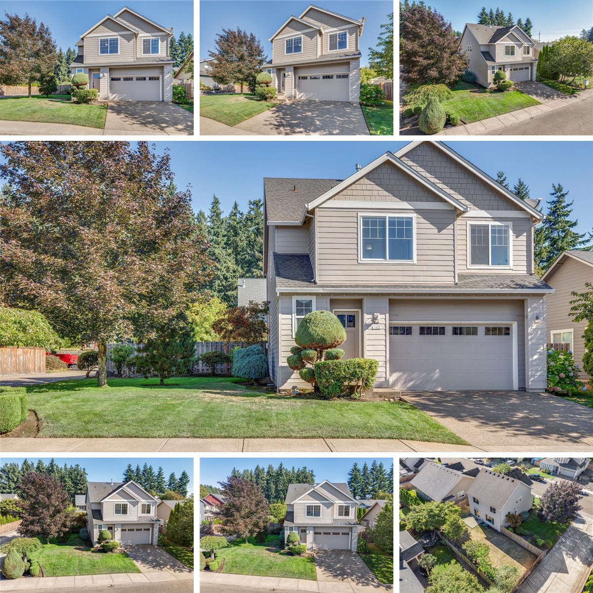 Canby 4-bedroom, 2.5-bath home with open great room layout. The main level features high ceilings and durable laminate floors, while the upstairs offers carpet throughout. The spacious primary suite has vaulted ceilings, a walk-in closet, and an en-suite bath with dual sinks and a walk-in shower. Enjoy plenty of storage in the garage and outdoor living in the fenced yard with sprinklers and a patio—perfect for relaxing or entertaining.